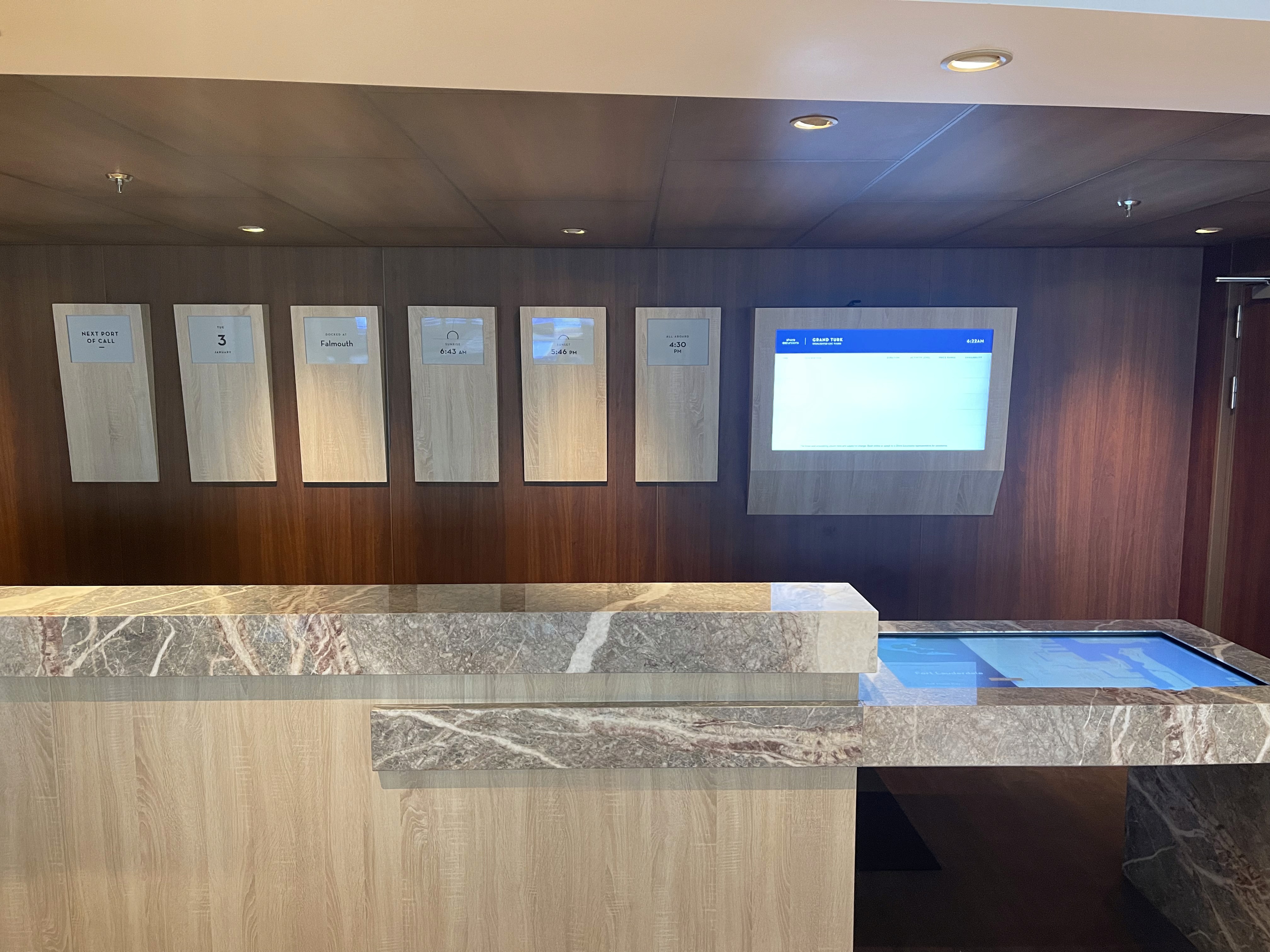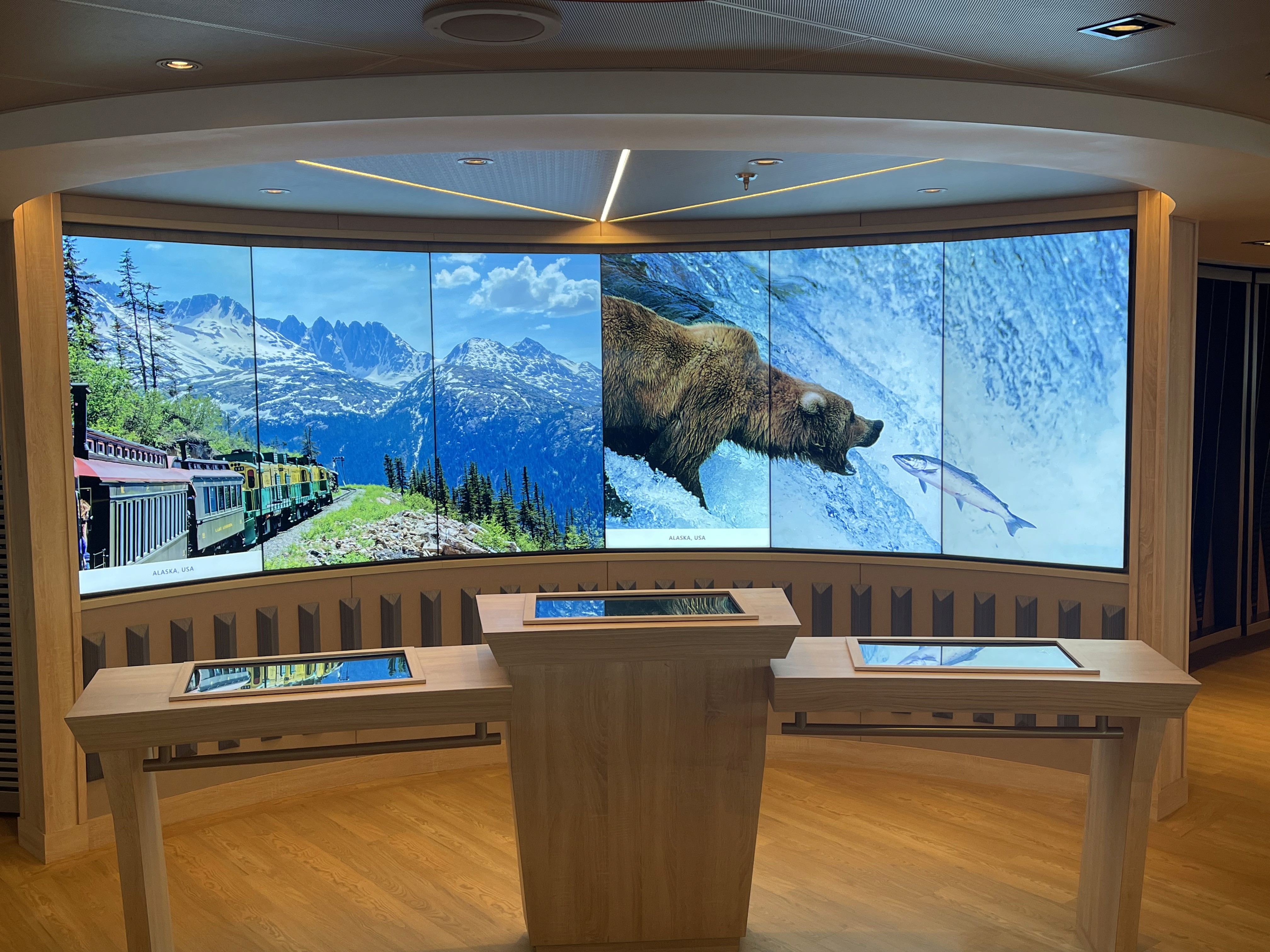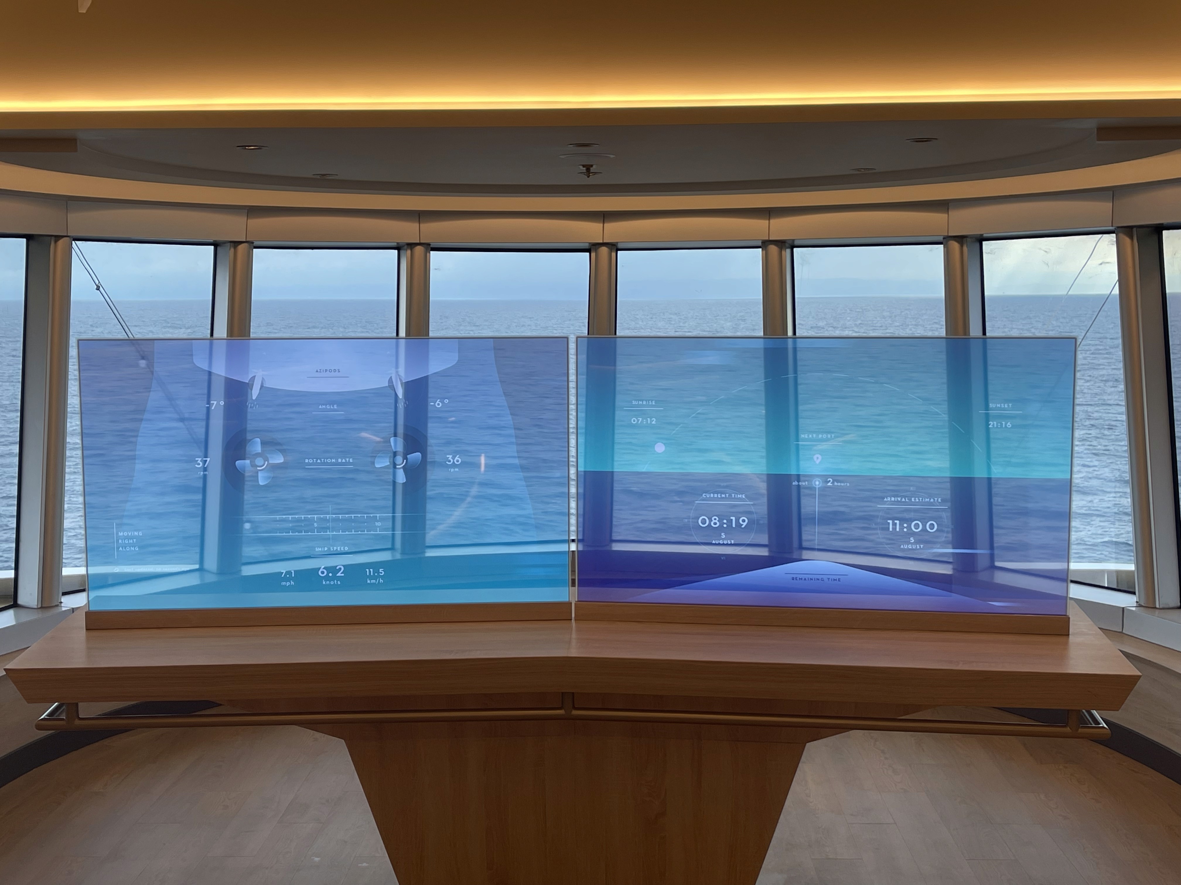 A series of five interactive experiences that encourage guests to gain a deeper understading of the ship they are on, the ports they are visiting, and the cruise world at large. One highlight is the Virtual Bridge, a pair of transparent OLED screens designed to make guests feel like they are on the ship's main brideg. The screens display current speed, direction, time to port, and other real time operating information.